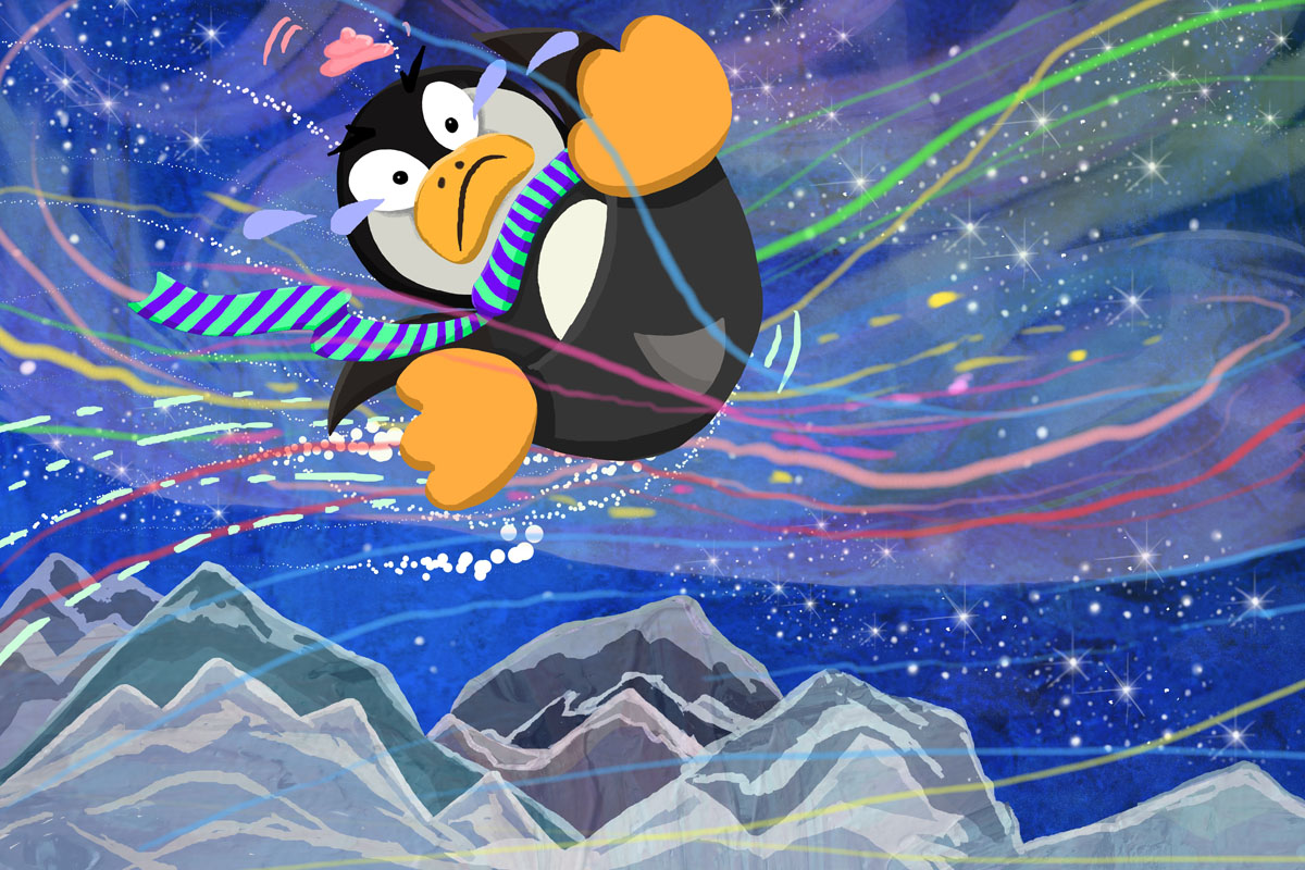A dynamic and poetic moment of a penguin falling through the sky while riding the Aurora.
