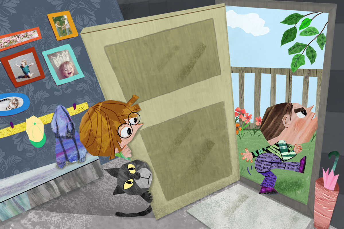 A poignant portrayal of a child's inner world, staring at a door in solitude.