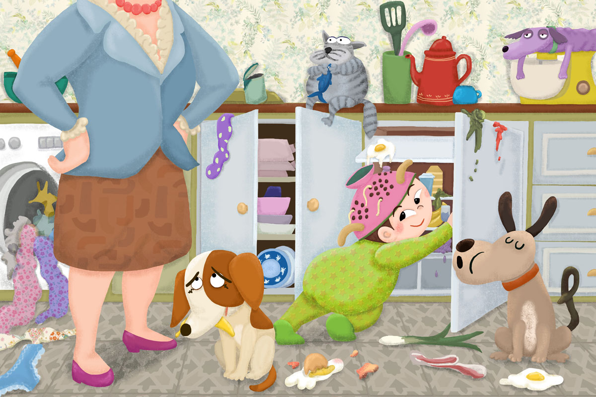A humorous and witty depiction of a child making a mess in the kitchen.